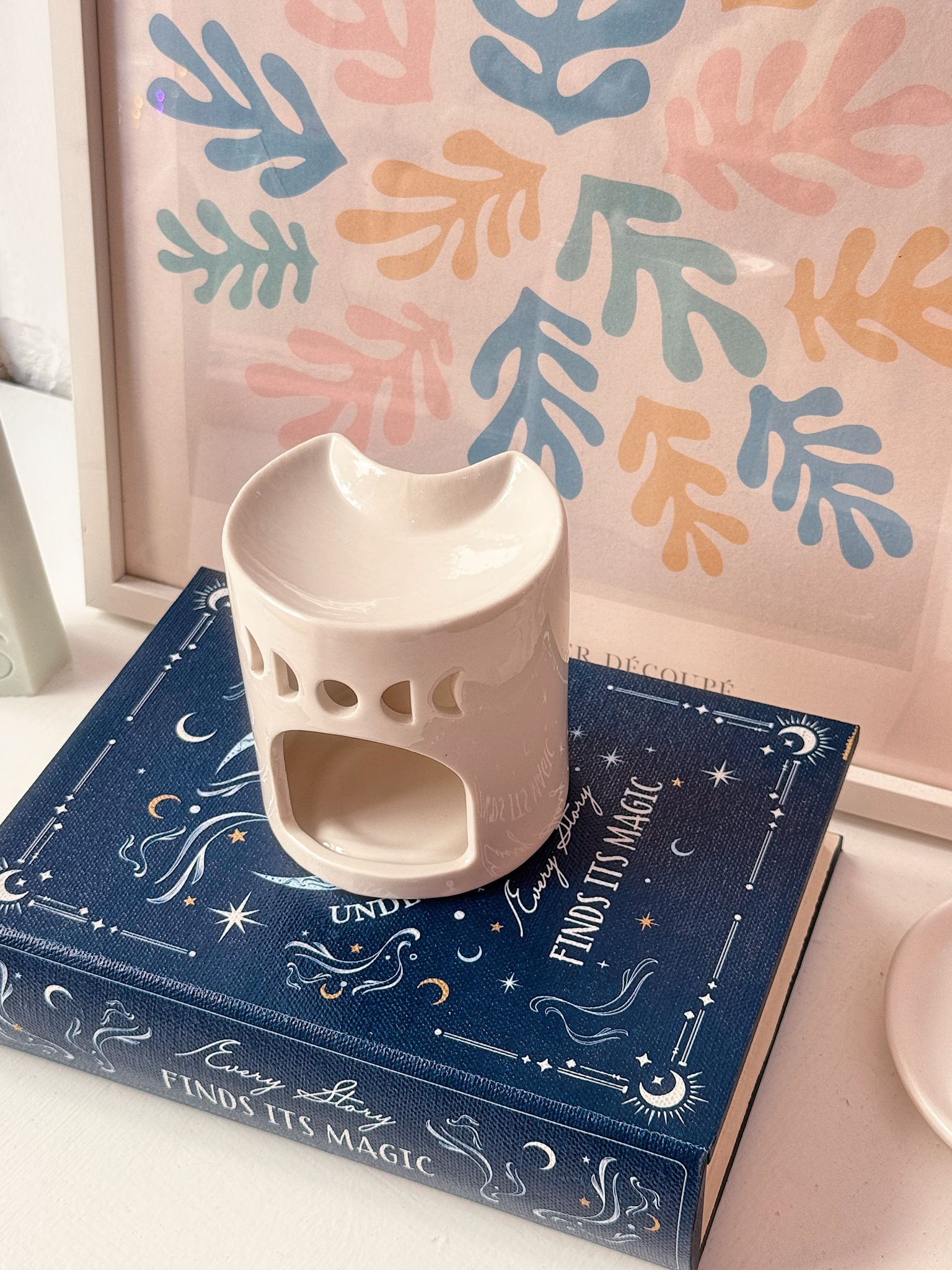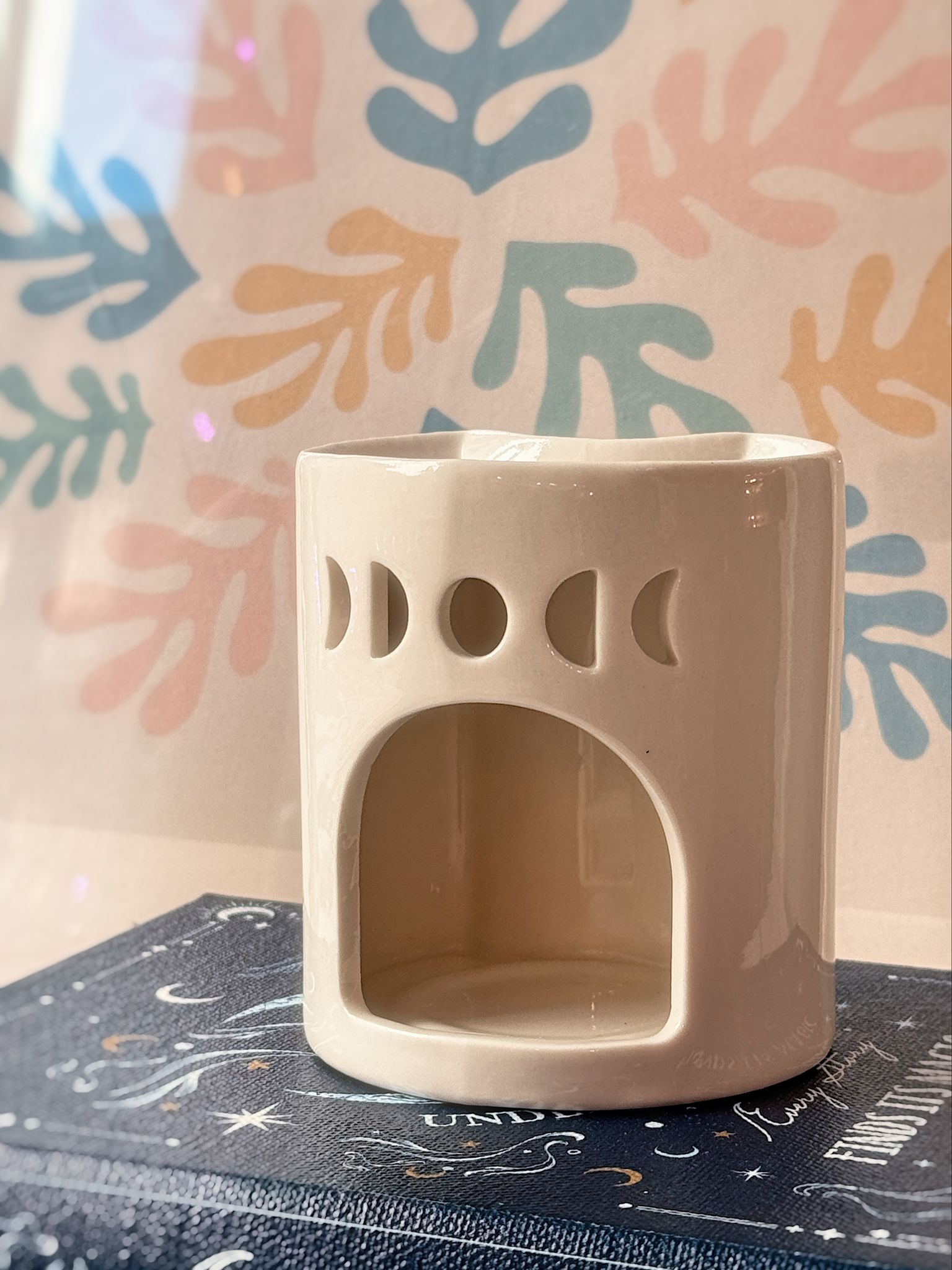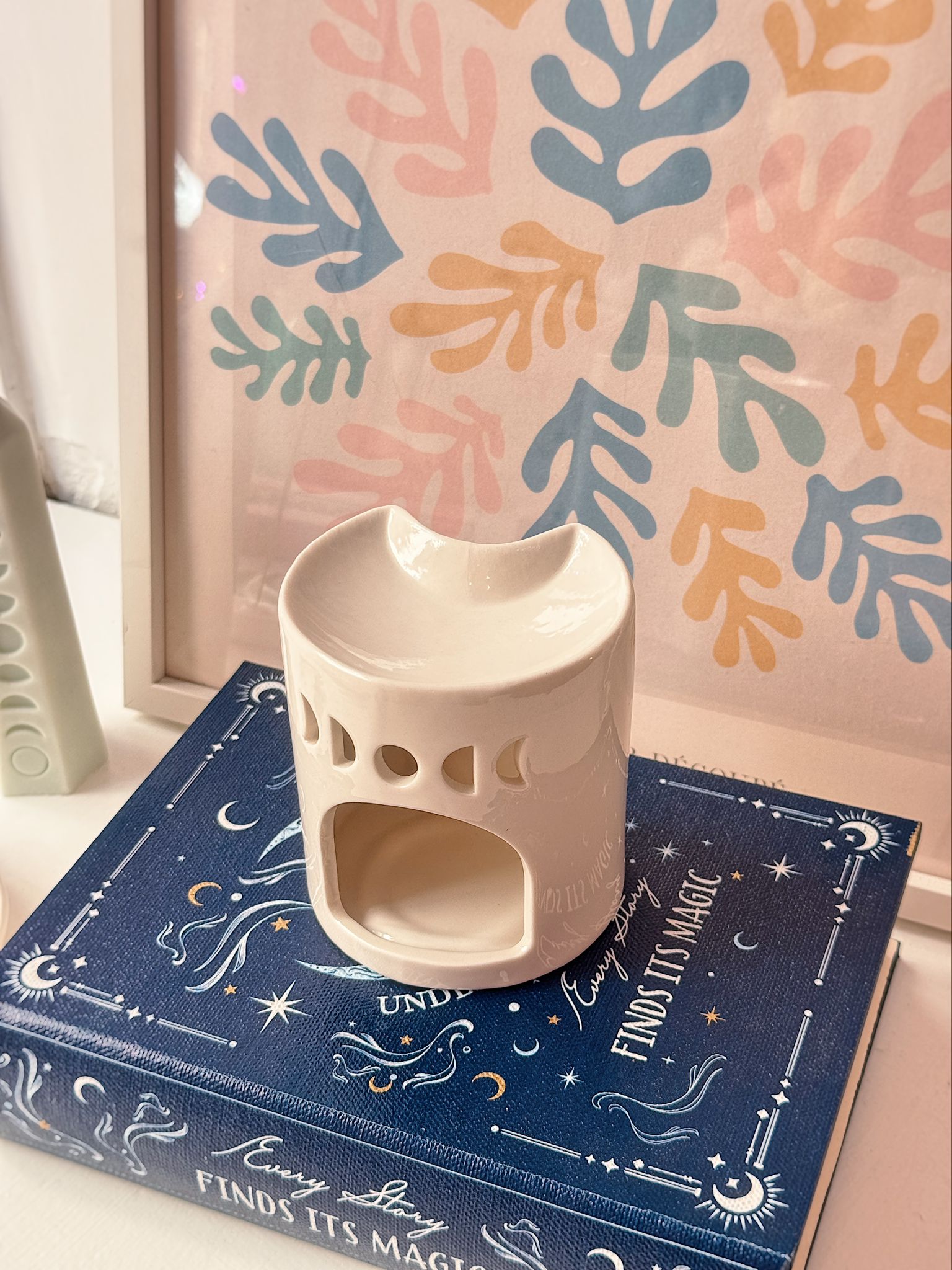 Bruciaessenze a forma di luna bianca a mezzaluna e fasi lunari intagliate. Posiziona nella parte sottostante una tealight e in quella superiore una tart profumata o delle gocce di essenza e goditi il tuo momento di relax