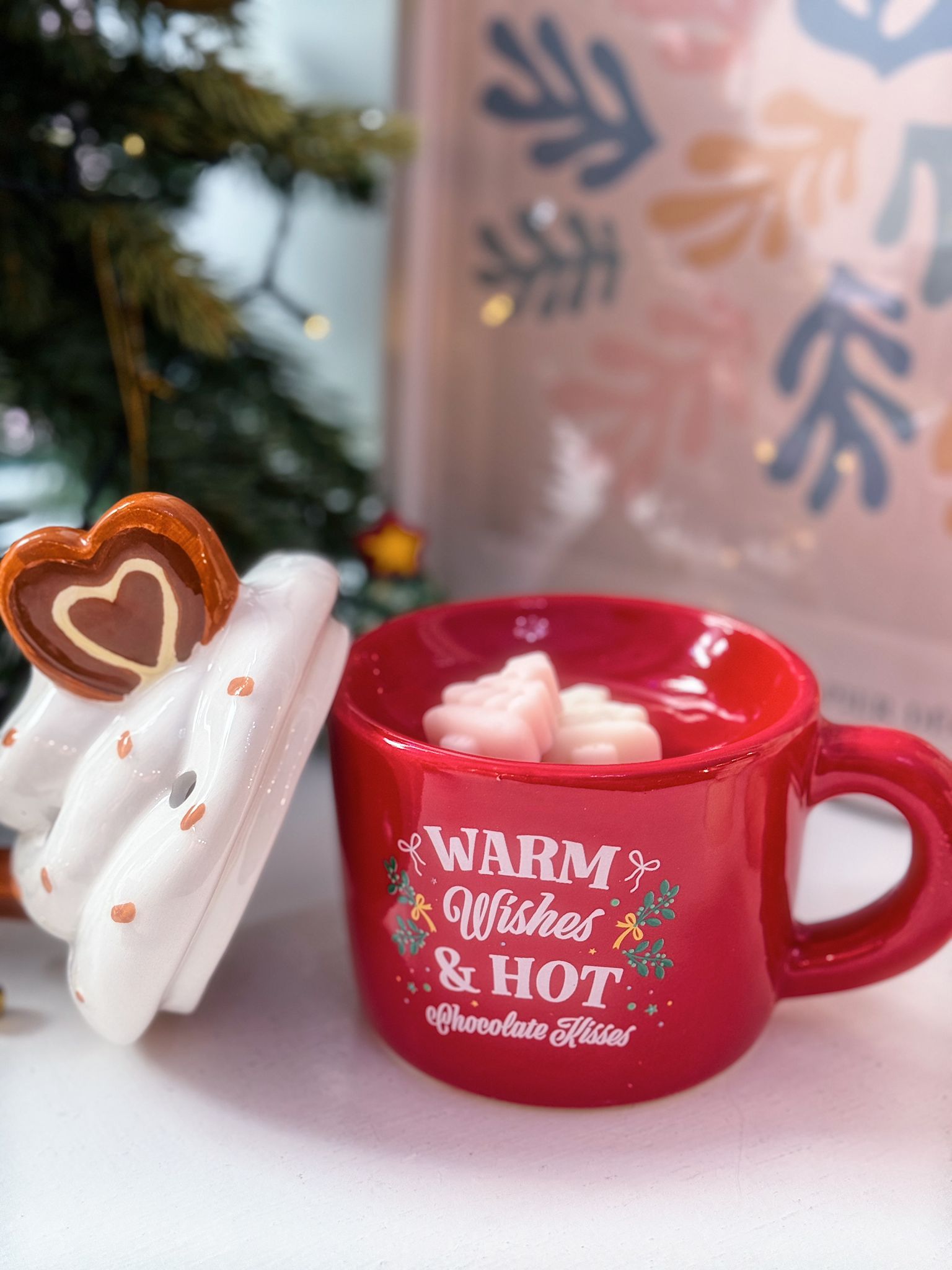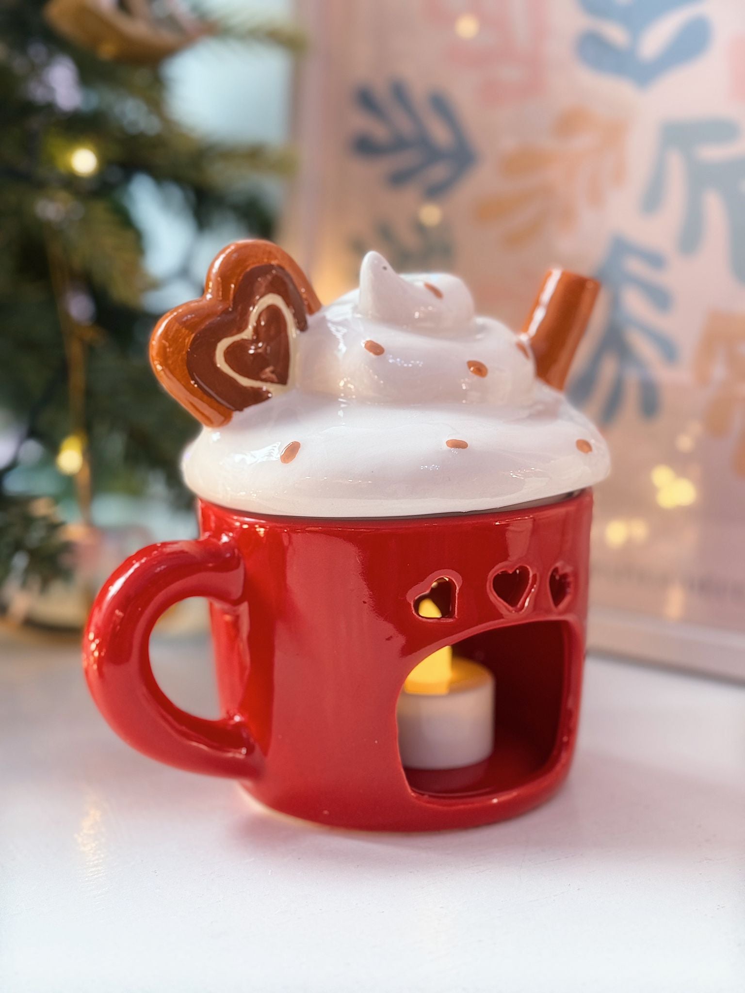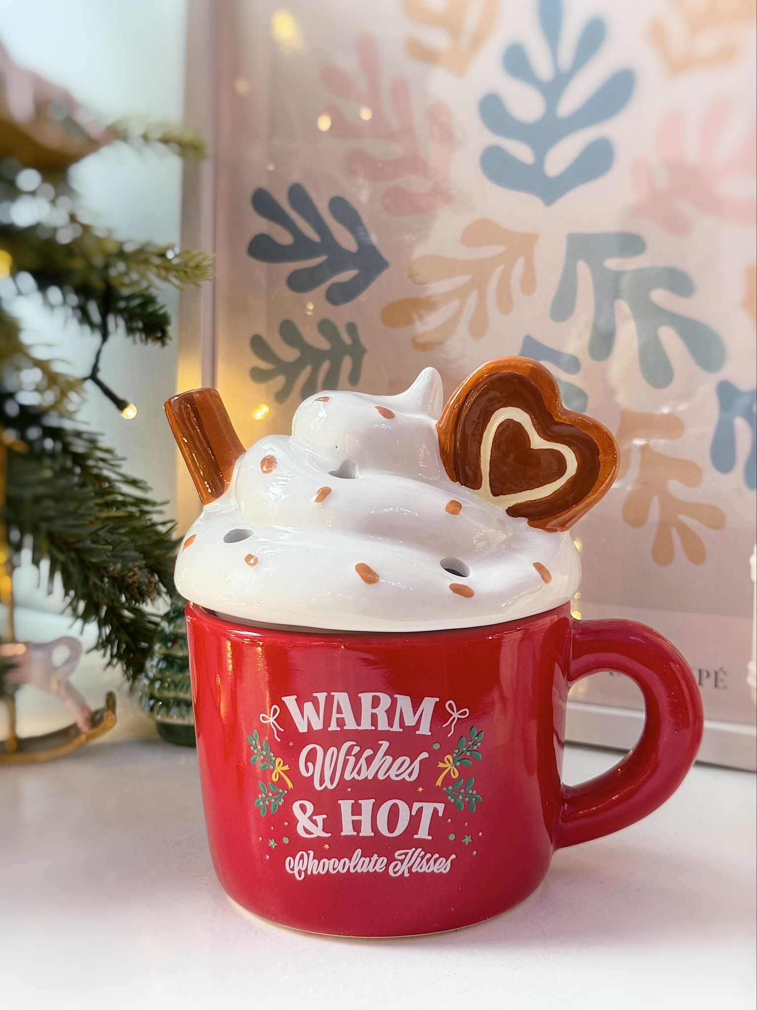 Respira un clima natalizio e profumato con questo bruciatore di essenze a forma di tazza con scritta “Auguri caldi e dolci di cioccolata calda”