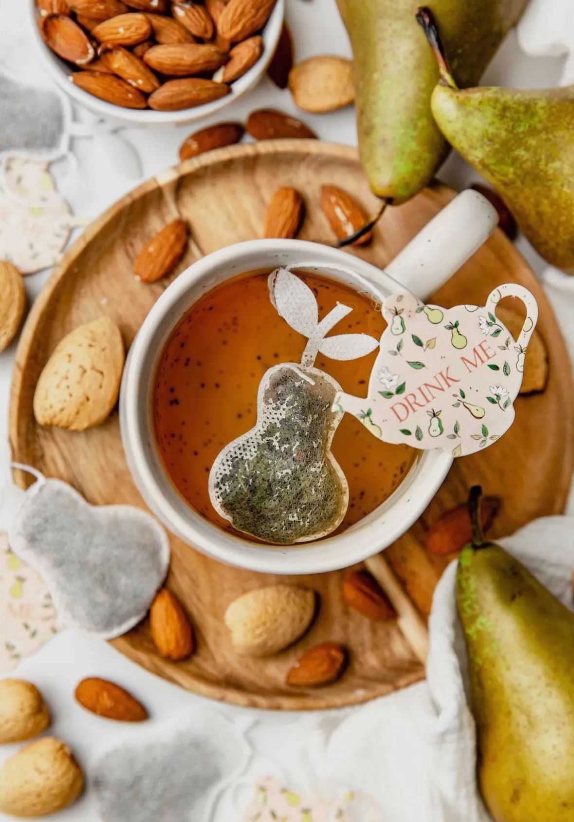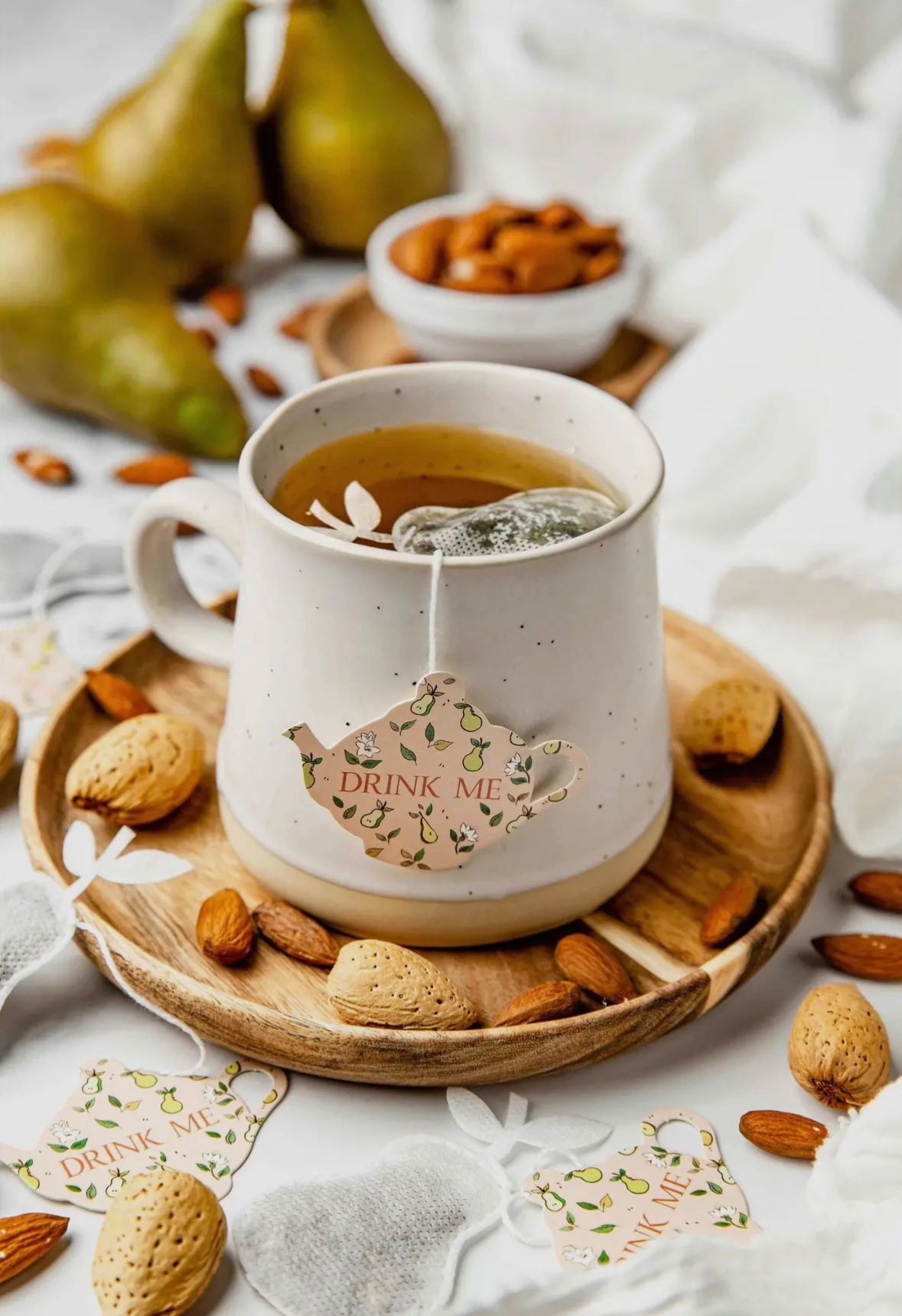 Bustina di tè biologica e artigianale, a forma di PERA, cucite a mano nel laboratorio di Lione. Il filo utilizzato è di cotone biologico, non contiene prodotti chimici e non scolorisce nell’acqua bollente; per il tessuto utilizzato, si tratta di una garza alimentare.