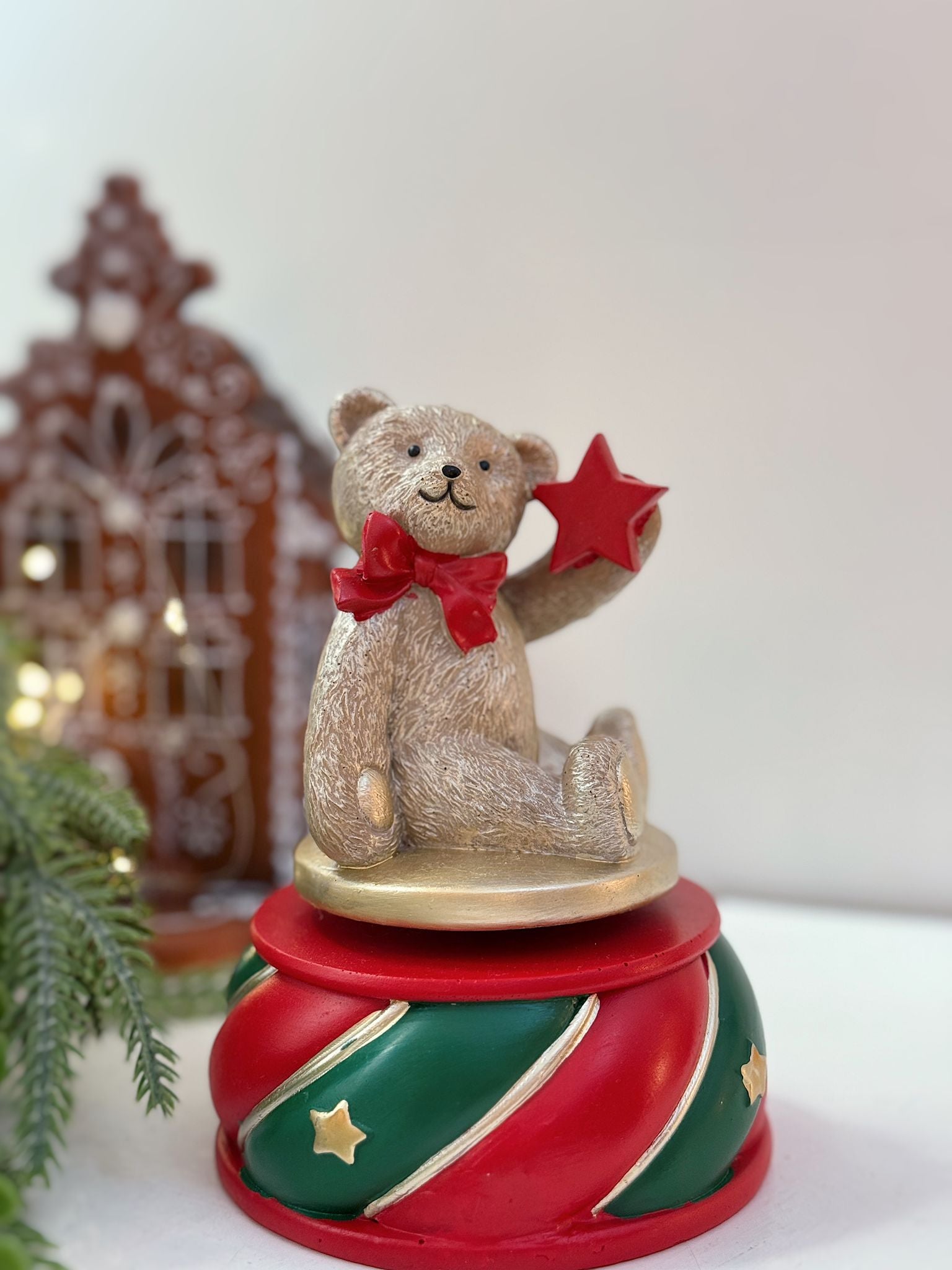 Questo affascinante carillon cattura l'essenza della magia natalizia con un adorabile orsetto che stringe una stella rossa. Il delicato fiocco rosso aggiunge un tocco di eleganza, mentre la base bicolore rosso e verde crea un contrasto visivo incantevole.