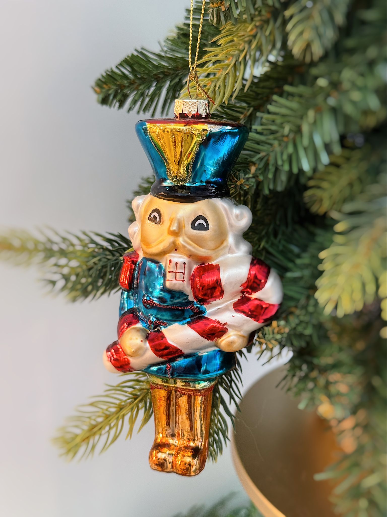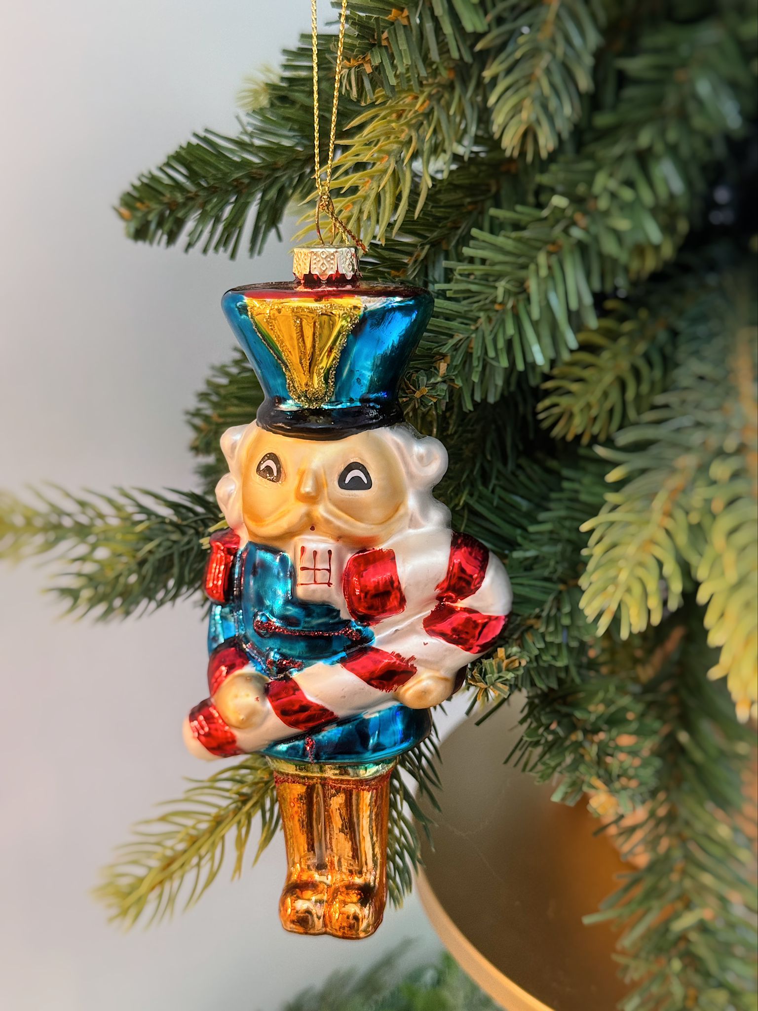 Scopri la magia delle festività con questa affascinante pallina schiaccianoci, un'aggiunta perfetta al tuo albero di Natale. Realizzata con dettagli eleganti che combinano zuccherino rosso e bianco con accenti blu e oro, questa decorazione cattura l'essenza dello spirito natalizio