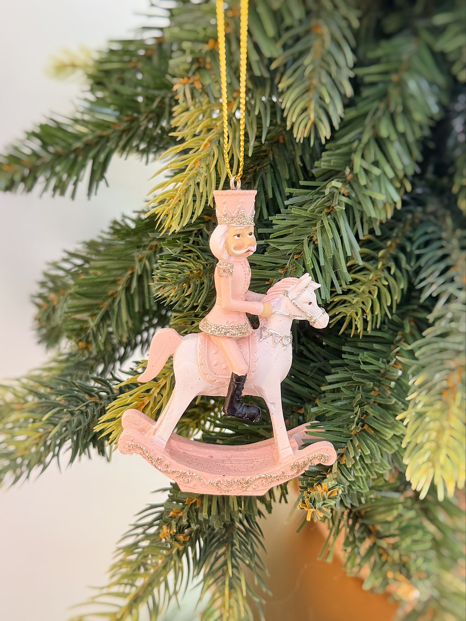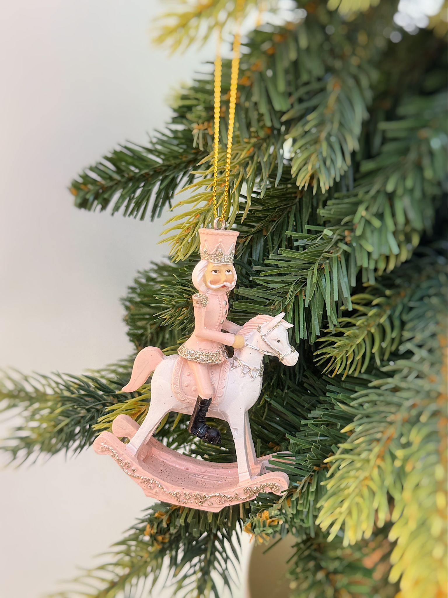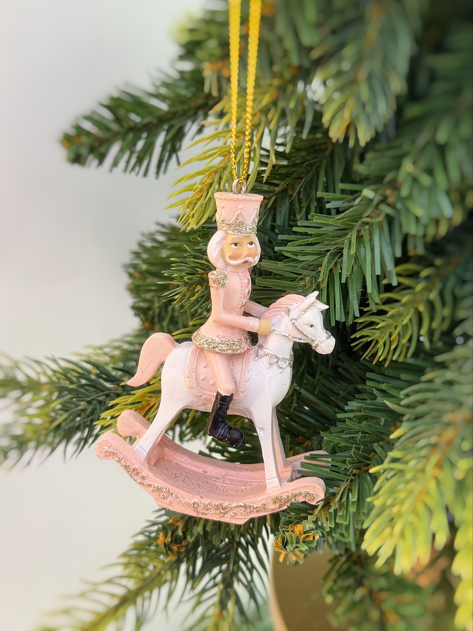 Trasforma il tuo albero di Natale in un capolavoro con questa affascinante pallina a forma di schiaccianoci seduto su un cavallo a dondolo. Il delicato contrasto tra il rosa e il bianco crea un'estetica sofisticata e festosa, perfetta per chi desidera decorazioni natalizie dal carattere unico. Questo ornamento cattura lo spirito magico delle tradizioni natalizie con un tocco di eleganza contemporanea