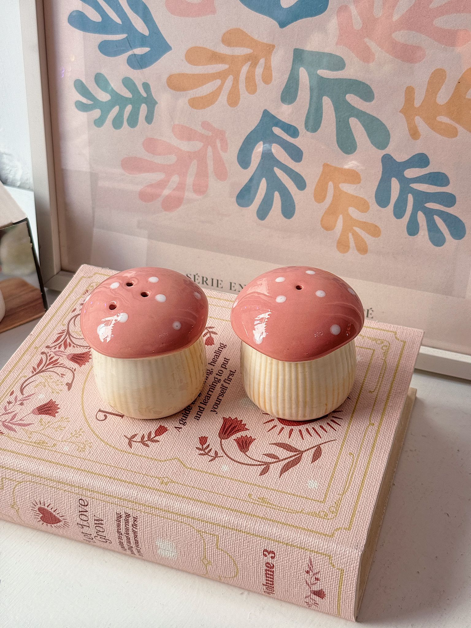 Porta una spolverata di magia e allegria a tavola con questo set sale e pepe a forma di funghetti rosa e bianchi.