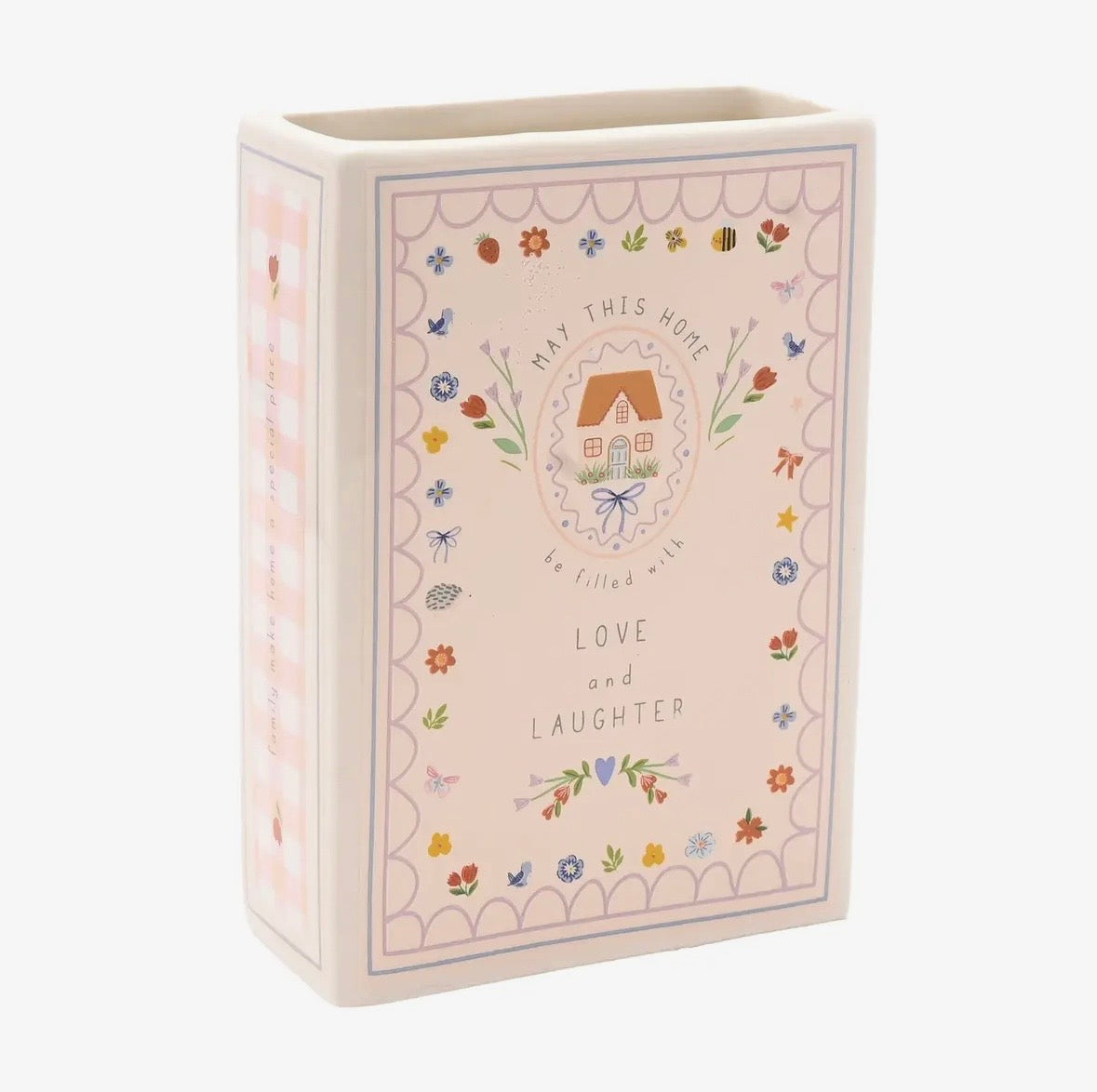 Un oggetto decorativo che parla di casa, calore e piccole gioie quotidiane. Questo vaso a forma di libro, in delicato rosa pastello, è impreziosito da illustrazioni dolci e da un messaggio che scalda il cuore: ““Che questa casa sia piena di amore e risate.”